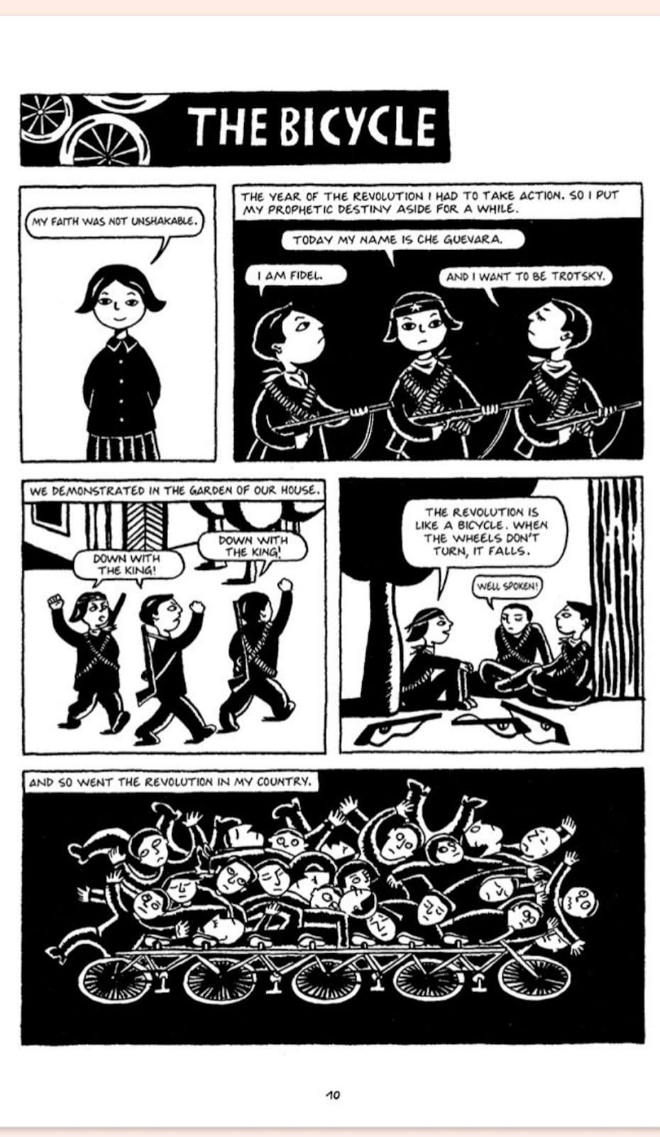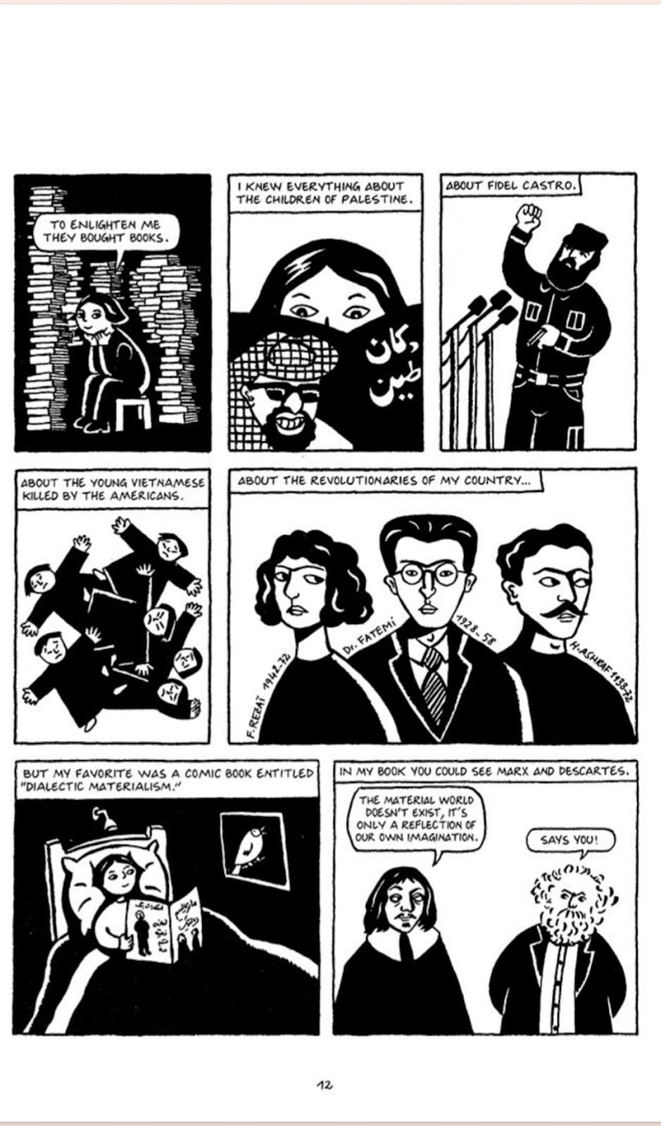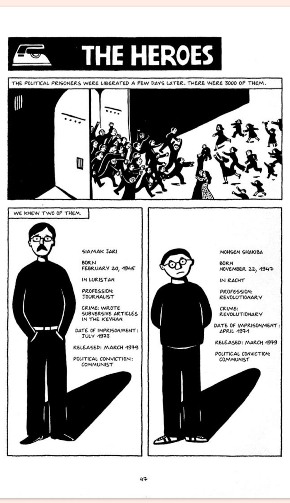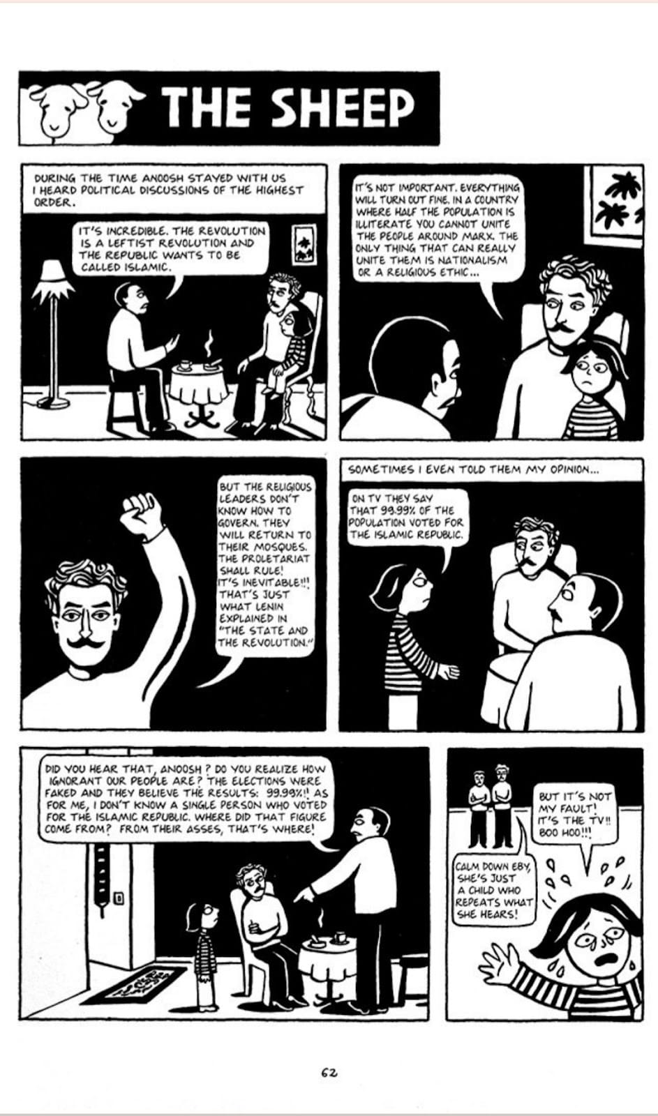 Mesto na kome se Marđan određuje su kreativne i sentimentalne scene koje opisuju njenu naklonost prema komunistima. Scene govore o njihovom stradanju i nepravdi koju trpe nakon dolaska Homeinija na vlast. Deo Marđanine porodice i njihovih prijatelja su komunisti i komunistkinje, i ona je upućena u njihov rad i ideje. Tu na površinu izbija njen politički stav, odnos prema religiji i tumačenje uspeha islamističkih snaga da dođu na vlast. Nakon izbora na kojima pobedu odnose islamisti, ona u usta svom nacrtanom protagonisti stavlja sledeći tekst: „Svaka revolucija ima prelazno razdoblje. Pola zemlje je nepismeno, nacionalizam i vera okupljaju ljude.“